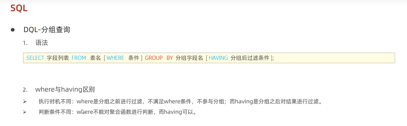 SELECT 字段列表 FROM 表名 [WHERE 条件] GROUP BY 分组字段名 [HAVING 分组后过滤条件];